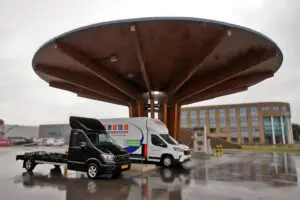 De elektrische bestelwagen van Stichting Kringloopcentrum Amersfoort-Leusden en de waterstofbestelwagen van E-Lions onder de luifel bij Fountain Fuel.